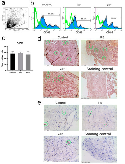 Characterization of the primary cultures of decidual macrophages (a–c). A representative forward and side scattering dot-plot (a). Flow cytometry analysis (b), representative histograms are provided for the control, late-onset preeclampsia (lPE) and early-onset preeclampsia (ePE) groups. Green curves represent staining control. The percentages of CD68-positive cells isolated from placenta samples collected from each group are indicated according to flow cytometry analysis (c). Immunohistochemical analysis (d,e), representative photos of decidual membrane stained with hematoxylin and anti-CD68 (d) or anti-CD56 (e) antibodies (DAB, brown, indicated by green circles), d: decidua, v: villi. Magnification, ×200; bars, 100 µm.