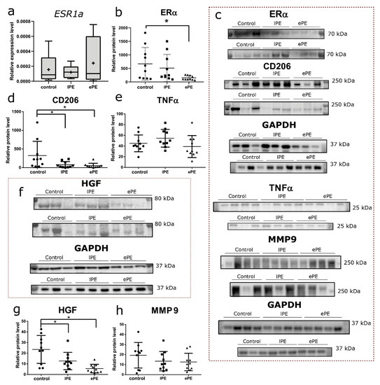 PCR and Western blot analysis of gene and protein expression by decidual macrophages for the control, late-onset preeclampsia (lPE) and early-onset preeclampsia (ePE) groups. Relative expression levels of ESR1a gene in the isolated decidual macrophages (a). Relative protein levels of ERα (b), CD206 (d), TNFα (e), HGF (g) and MMP9 (h) in decidua basalis, normalized by GAPDH level. Representative Western blotting membranes stained with antibodies to ERα, CD206, TNFα, GAPDH and MMP9 (c), HGF and GAPDH (f). * p < 0.05 compared to the control group according to ANOVA with Dunnett’s post hoc test.