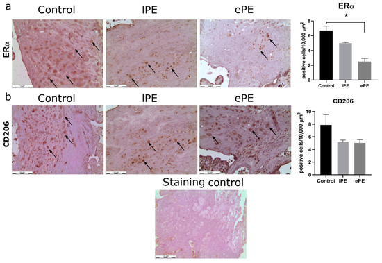 Immunohistochemical analysis of ERα- and CD206-positive cells in decidua basalis of lPE, ePE and the control placenta samples. The percentages of ERα- and CD206-positive cells per 10,000 μm2 are indicated. Representative photos of sections stained with hematoxylin and anti-ERα (a) and anti-CD206 (b) antibodies (DAB, brown, indicated by black arrows). Magnification, ×200; bars, 100 µm. * p < 0.05 vs. control group according to Kruskal–Wallis non-parametric ANOVA with post hoc Dunn test.