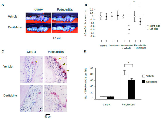 Female C57BL/6 mice aged 10 weeks were purchased from the Jackson Laboratory (Bar Harbor, ME, USA). Animals were housed under specific pathogen-free conditions, and food and water were provided ad libitum. The animal experiments were approved by the Institutional Animal Care and Use Committee of the University of Pennsylvania (protocol approval no:805456), and all animal experiments complied with the ARRIVE guidelines (Animal Research: Reporting of In Vivo Experiments). Decitabine (5-aza-2′-deoxycytidine; Sigma-Aldrich, St. Louis, MO, USA) was diluted in 2% carboxymethylcellulose and administered to the mice by oral gavage at a dose of 1 mg/kg/day. Vehicle (2% carboxymethylcellulose) was administered as a control. Mice were divided into four groups: (1) control (no periodontitis and administration of vehicle, n = 5); (2) decitabine (no periodontitis and administration of decitabine, n = 5); (3) periodontitis + vehicle (ligature-induced periodontitis and administration of vehicle, n = 5); and (4) periodontitis + decitabine (ligature-induced periodontitis and administration of decitabine, n = 5).