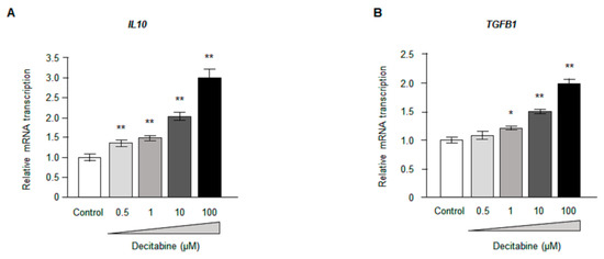 Decitabine dose dependently increased anti-inflammatory cytokine in vitro. (A,B) mRNA expression of IL10 (A) and TGFB1 (B) measured by real-time PCR. The mRNA level was normalized to the mean control value. * p < 0.05, ** p < 0.01 vs. control.