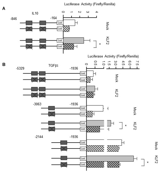 Effects of Krüppel-like factor-2 (KLF2) overexpression on genes encoding anti-inflammatory cytokines. HEK293T cells were co-transfected with the indicated luciferase reporter for interleukin (IL)-10 or transforming growth factor beta-1 (TGFβ1) expression and either a KLF2 overexpression plasmid (KLF2 columns) or empty vector (mock columns). Luciferase activity was normalized to Renilla luciferase activity. (A) Averaged data for luciferase activity in experiments using the luciferase reporter for IL-10. * p < 0.05 vs. IL-10 promoter with KLF2 overexpression plasmid. (B) Averaged data for luciferase activity in experiments using the luciferase reporter for TGFβ1. * p < 0.05 vs. TGFβ1 promoter with KLF2 overexpression plasmid.