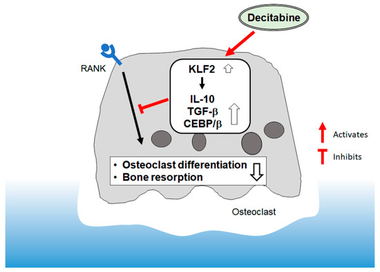 The present study found that decitabine suppressed osteoclast differentiation in a concentration-dependent manner. Despite inhibiting osteoclast differentiation, decitabine activated CD14+ monocytes to increase their expression of IL10 and TGFβ1 mRNA. Furthermore, the expression of KLF2 was increased at both the gene and protein level, and overexpression of KLF2 enhanced the transcription of IL10 and TGFβ1 in HEK293T cells. Taken together, our findings suggest that decitabine inhibits bone resorption in mice with periodontitis by upregulating KLF2 expression and thereby enhancing the expression of IL10 and TGFβ1 (Figure 6).