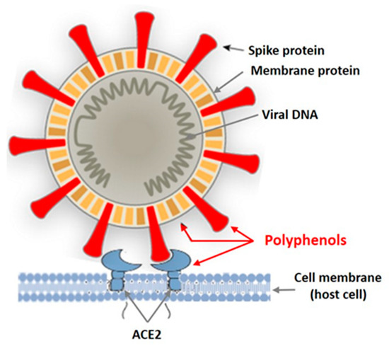 In recent years, intensive studies of the antiviral activity of polyphenolic compounds from terrestrial plants, as well as from various marine aquatic organisms, including macroalgae, have been carried out [38,39,40,41]. Mainly enveloped viruses are reported as sensitive to PPs. Figure 2 shows the targets of the enveloped virus that can be affected by plant polyphenols.