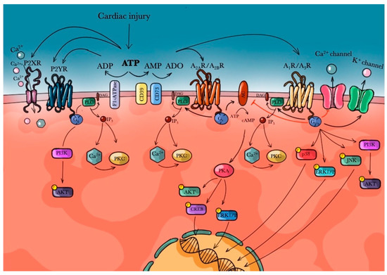 The signaling induced by A1R and A3R inhibits the activation of the membrane-bound protein Adenylate Cyclase (AC), which catalyzes the conversion of ATP to 3’,5’-cyclic AMP (cAMP). On the other hand, A2AR and A2BR signaling is characterized by the increase of intracellular cAMP levels, due to the activation of AC. cAMP is responsible for the activation of three main targets: the serine/threonine Protein Kinase A (PKA), the Exchange protein activated by cAMP (Epac) and Cyclic Nucleotide-Gated Ion Channels (CNGCs) [65]. PKA catalyzes the phosphorylation of several cellular substrates, acting on both ion channels, cellular transporters and exchangers, Ca2+ channels and pumps, and Transcription Factors (TFs), thus conferring it a considerable role in the regulation of gene transcription and in the influence of the heart contractility [71]. In fact, ARs are ubiquitously distributed in different organs and tissues and also in heart tissue [72] and in coronary arteries [73]; it has been shown that PKA dysfunction is related to cardiac dysfunction and heart failure [74].