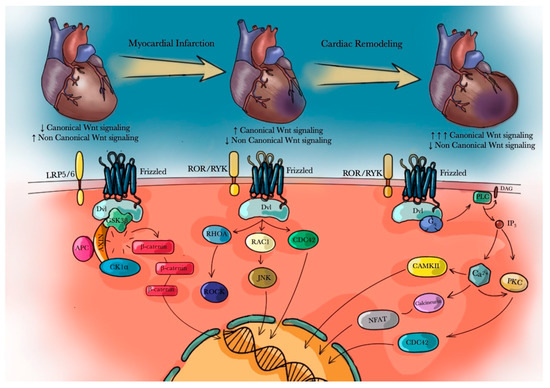 In the heart, non-canonical Wnt pathways might antagonize canonical Wnt signaling during cardiac development, and this would explain the sophisticated balance between the non-canonical and the canonical Wnt pathway. Indeed, Wnt signaling pathways are activated during cardiomyogenesis, although they are consequently inhibited to avoid an excessive heart development [105]; however, a further activation of canonical Wnt pathway might be enhanced following myocardial injury [8], due to mechanisms of “counter-regulation” of the infarct process in order to preserve the heart attacked area. However, the activation of this pathway in a post-infarct environment could contribute to the establishment of LV remodeling. An excessive canonical Wnt activation might activate signaling cascades, promoting rearrangements of the cytoskeletal structure of cardiomyocytes. This final effect could potentially lead to cardiac remodeling and let us to hypothesize that abnormalities of these pathways might be considered as risk factors for the development of different cardiovascular pathological conditions. Therefore, the fine regulation of Wnt signaling pathways is essential in repairing and protecting cardiac tissue post MI [106]. As a matter of fact, several evidences showed a correlation between myocardial injury and Wnt signaling pathway activation.