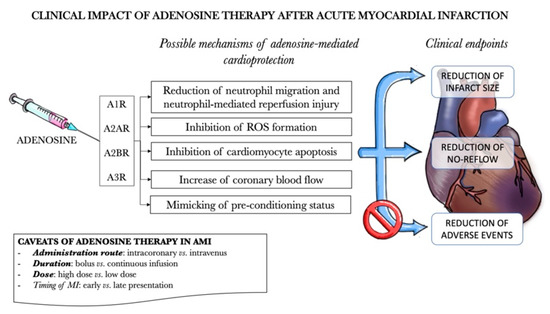 Pre-clinical studies suggested multiple beneficial effects of adenosine agonists use, supporting adenosine as a potential cardioprotective agent during AMI (Figure 3) [170,171]. Treatment with adenosine consistently reduced infarct size, improved left ventricular function and coronary blood flow in animal models: the mechanisms proposed to demonstrate adenosine efficacy are reduction of (i) neutrophil activation and migration, (ii) neutrophil-mediated reperfusion injury, (iii) oxygen free radical formation, (iv) cardiomyocytes apoptosis and increase of coronary blood flow. In addition, adenosine appeared to mimic and potentiate ischemic pre-conditioning, protecting from subsequent reperfusion injury.