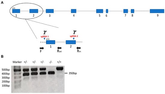 A current zebrafish genome annotation (GRCZ11) in Ensembl was used for zebrafish gene coding and transcript information. For sgRNA design, CHOPCHOP software was employed []. Published protocol from Gagnon et al. (2014) [] was followed to generate templates for sgRNA transcription by annealing gene specific oligonucleotides containing the T7 promoter sequence, the 20 base pairs (bp) target site (Table 1) followed by the PAM sequence, and a complementary region of 80 bp constant oligonucleotide. We synthesized three sgRNAs to be injected simultaneously to achieve multi-exon deletion. All sgRNAs were transcribed using the MAXIscript T7 kit (Life Technologies, Carlsbad, CA, USA), and the resulting RNA was purified using 5M ammonium acetate and ethanol precipitation. RNA bands were detected by electrophoresis on a 1% agarose gel and RNA purity and concentration were measured using NanoDrop 1000 spectrophotometer (ThermoFisher, Waltham, MA, USA). Zebrafish embryos were microinjected at the 1-cell stage. An injection solution was prepared as following: 40 ng/µL for each sgRNA, 20 ng/µL Cas9 protein (New England BioLabs, Ipswich, MA, USA), and 0.1% Phenol Red (Sigma, Burlington, MA, USA). Dead and deformed fish embryos were removed, and healthy ones were raised to adult fish as F0 founders.