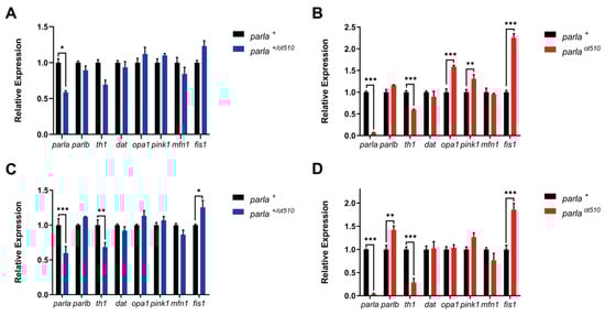 Knowing that parla is expressed ubiquitously [], we analyzed gene expression throughout the entire body of larvae. The most noticeable changes in expression were seen in parla ot510 larvae for th1, opa1, pink1, and fis1 genes. There were 31% and 41% decreases in th1 expression in both parla +/ot510 and parla ot510 larvae, respectively (Figure 2A,B). However, statistical significance was not reached for parla +/ot510 larvae. This decrease in expression is in line with the decrease in th1 expression observed in the brain of parla ot510 adults. In addition, there were significant increases of 60% and 31% in opa1 and pink1 expression, respectively, in parla ot510 larvae (Figure 2B). Similarly, opa1 and pink1 expression was increased by 12% and 10%, respectively, in parla +/ot510 larvae, but this did not reach statistical significance (Figure 2A). The highest increases in expression were observed for fis1 in parla ot510 larvae, which reached 2.25 times the levels measured in WT (parla +) controls (Figure 2B). In parla +/ot510 larvae, fis1 expression showed a 23% increase, but this did not reach statistical significance (Figure 2A). These increases in fis1 expression are in line with those seen in the brain of adult parla ot510 fish. Finally, the expression levels of parlb, dat, and mfn1 genes did not change significantly compared to WT controls (Figure 2A,B).