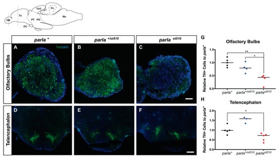 To determine the effect of parla loss-of-function on DA neuron number and patterning, we performed IHC assays in adults ranging from 7 to 12 mpf in both the telencephalon and olfactory bulb regions using TH1 antibody which is widely used for the detection of DA neurons []. A reduction in TH positive (TH+) cell number reflects loss of DA neurons. Numbers of TH+ cells for both parla ot510 and parla +/ot510 mutants were compared to WT (Figure 3A,D). TH+ cell reductions of 60% and 20% were observed in the olfactory bulbs (OB) for both parla ot510 and parla +/ot510 animals, respectively (Figure 3B,C,G). Similarly, a mild reduction of 25% in TH+ cells was seen in the telencephalon for parla ot510 mutants (Figure 3F,H). These reductions corroborate the previously observed decrease in th1 expression level. On the other hand, there was no observable decrease in TH+ cell number in the telencephalon for parla +/ot510 mutants (Figure 3E).