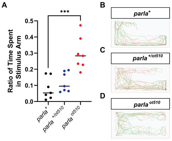 To determine if the loss of DA neurons in the OB of adult mutants has implications on olfactory function, we performed a repulsive stimulus test. The repulsive stimulus used in this experiment is cadaverine, which was administered to the arm of an apparatus in which the fish was acclimatized []. The time spent in each section of the tank was then recorded and the ratio of time spent in stimulus arm was calculated. Interestingly, parla ot510 fish spent on average of more than 3.5 times of the recorded period in the stimulus arm where cadaverine was added compared to the WT zebrafish (Figure 4A,B,D). On the other hand, there was a 48% increase in the ratio of time spent in the stimulus arm observed in parla +/ot510 mutants (Figure 4A,C).