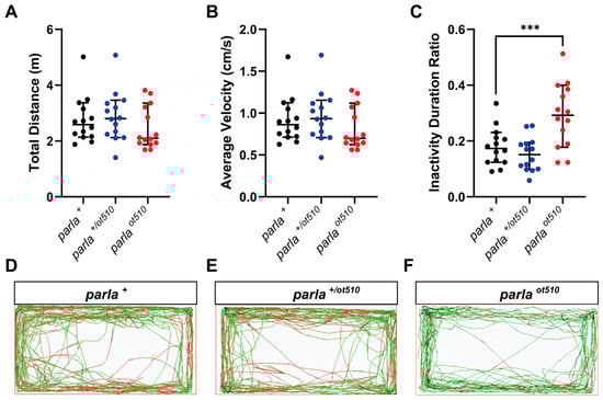 Swimming activity of adult mutant and WT zebrafish. (A–C) Impact of parla loss-of-function on total swim distance, average swimming velocity and inactivity periods (n = 14 adult zebrafish). (D–F) Path images of a representative for WT fish (parla +), homozygous mutants (parla ot510), and heterozygous mutants (parla +/ot510). Bars represent the Median with 95% CI. *** (p < 0.001).
