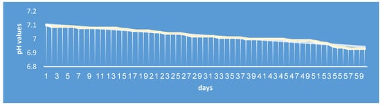 Excess H3O+ ions are bound by OH− anions, which are formed as a result of complete dissociation of sodium hydroxide. The equilibrium state is established at pH = 6.9–7.1. The solution remains colorless and clear, and [Ag(MTZ)2]+ ions are present. The period of use of the manufactured product for individual patients was 1 month from the moment of opening the bottle, which is the generally accepted rule for eye drops and pharmaceutical standards all over the world. The form of the drug was produced according to an ex tempore pharmacy recipe. The dosage form prepared in the formulation was stored and evaluated for change in pH, clarity and transparency over 2 months. The pH did not change significantly during this time in storage. The pH value changed during storage to a minimum value of 6.9 (Figure 2). After 6 months of storage at room temperature, silver (I) oxide began to appear. Storing the drops at 2–8 °C in a refrigerator did not produce such results (Figure 3).