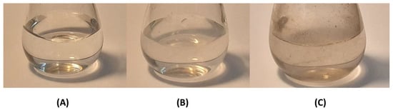 Eye drops solution on the first day (A) and 6 months after preparation, stored in a refrigerator (B) and at room temperature (C).