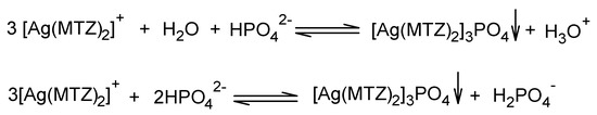 The desired pH can be achieved by adding a buffer solution. Buffer solutions added to eye drops provide the required pH and isotonic properties. The reaction uses isotonic phosphate buffers to obtain a pH in the range of 6.0–8.0 and borate buffers to obtain a pH of 5.0–10.6. This is not possible with silver salts and silver complexes. Furthermore, reactions involving precipitation of very sparingly soluble silver (I) salts, such as borates (Scheme 2 and Scheme 3) or phosphates (Scheme 4), which do not have therapeutic properties, result in the solution becoming a suspension with particles that can irritate the eye.