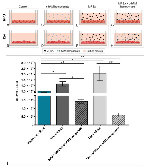 2.5. Analysis of the Antibacterial Activity of hAM Homogenate on Biomimetic In Vitro Models of Normal and Cancerous Urothelia Infected with MRSA
