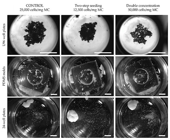 MCs-assisted MT formation is based on the intrinsic capacity of cells to self-assembly during 3D culture through ECM deposition [39]. Static MTs formation was performed using different cell culture conditions and seeding densities. The cell culture conditions included the usage of various strategies, such as PDMS molds, U96 (u-shaped bottom surface), and flat 24-well low-attachment plates (Figure 2). In PDMS molds, no MTs were formed during 21 days of culture at any cell seeding condition, with cells spreading on PDMS and MCs randomly distributed in the wells. In U96 plates and 24-well plates cells were found attached to MCs and deposited ECM embedding them, forming MTs. No significant differences were found in the MTs size between the different cell-seeding conditions tested in U96 well plates. However, by using low-attachment surfaces that promote cell aggregation [11,40], differences in seeding protocol were observed. The two-step seeding protocol with a final cell/MC concentration of 25,000 cells/mg MC yielded statistically significant larger MTs (16.07 ± 2.83 mm2, p ≤ 0.001) than the two other conditions (8.71 ± 2.40 mm2 for 50,000 cells/mg; and 7.58 ± 1.11 mm2 for control condition) (Figure 2). Between U96 and 24-well plates approaches, MT size statistical differences were only found in the two-step seeding of 12,500 cells/mg MC (16.07 ± 2.83 mm2 for 24-well; 6.76 ± 2.12 mm2 for U96). MTs generation in 24-well plates resulted in the formation of dense structures easy to manipulate. Moreover, low-attachment plates also promoted cell attachment to PLA MCs. In contrast, U96 conditions showed a less dense structure where pores along the MT were easily observed (Figure 2).