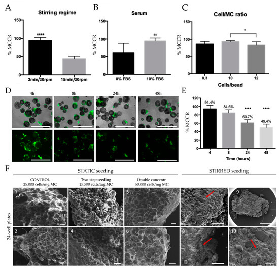 Generally, static seeding is described to be inefficient compared to dynamic seeding procedures, yielding lower efficiency and poor homogeneity [43]. Improved cell-MC attachment using intermittent agitation has been extensively reported against static or continuous regime [44]. To improve cell seeding, MCs colonization was further studied in dynamic conditions using a spinner flask bioreactor [16,45,46,47] to homogenize the cellular distribution and CDM deposition along the MTs. An intermittent stirring regime, serum deprivation, and cell/MCs ratio were investigated as main parameters involved in the optimal MCs colonization. Cell cultures were stirred intermittently at 30 rpm using two different stirring regimes for eight hours—8 h: 3 min 30 rpm/27 min 0 rpm and 15 min 30 rpm/15 min 0 rpm. Up to 94.37% of MCs were colonized after 8-h cell seeding applying a 3-min stirring regime, whereas only 43.29% of MCs were colonized in the 15 min regimen (Figure 3A). These differences in MC colonization could be explained by higher cell death resulting from longer stirring periods, as well as by an increased number of cell clusters. Total deprivation of FBS showed a significant decrease (60.6%) in MCs colonization compared to the FBS supplemented cell media (94.4%) (Figure 3B). Although serum usage in cell seeding is still controversial [48], our results indicate that its presence is critical for cell adhesion to MCs. This increase in cell adhesion can be explained by the adsorption of serum protein to functionalized biomaterial surfaces [49,50], demonstrating serum as an indispensable media component for cell adhesion in MCs.