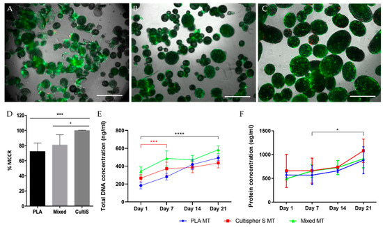 In order to evaluate the effect of materials on cell behavior and CDM deposition, PLA MTs’ were studied and compared to MTs produced using the commercially available Cultispher® S MCs and the combination of both MC types (mixed MTs). Initially, MC cell adhesion, survival (Figure 4A–C), proliferation, and protein deposition were assessed for every condition. All MC types successfully allowed cell adhesion, with Cultispher® S MCs (99.8% MCCR) showing the highest cell colonization compared to the other conditions (PLA MTs: 72.0%; mixed MTs: 80.7% MCCR) (Figure 4D). These differences are related to MC composition, porosity, roughness, and size. Gelatin, the main component of Cultispher® S MCs, is a natural polymer that inherently contains important biological cues for protein adsorption and cell adhesion [55].