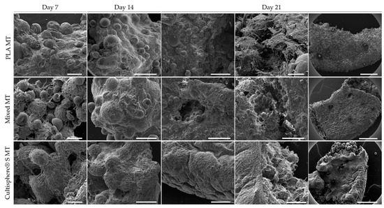 Once determined the optimal culture conditions for MTs fabrication, PLA (PLA MT), Cultispher® S (CultiS MT), and a combination of both PLA and Cultispher® S (1:1) (mixed MT) MTs were produced following the established protocol for culture periods of 1, 7, 14, and 21 days.