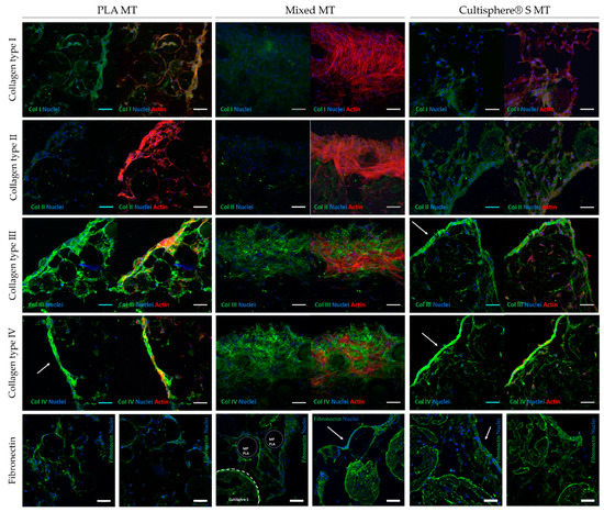 Immunofluorescence staining of sliced MTs for collagen types I, II, III, IV, and fibronectin (green), actin (red), and nuclei (blue), scale bars = 100 µm. The arrowheads point to protein localization.