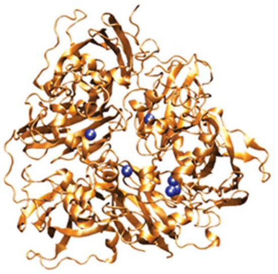 Crystallographic three-lobed structure of human holoceruloplasmin, showing the positions of the 6 internal (integral) copper atoms (dark blue), and based on the studies of Zaitseva et al. [16]. Reprinted with permission from ACS C & E News (8533scicon_cp). Two additional “labile” copper binding sites on the surface of the molecule have also been identified in vitro [17,18,19], although it is unclear that these are normally occupied in vivo.