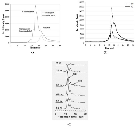Examples of elution of plasma copper-binding components in large pore size exclusion chromatography detected by tandem ICP-MS, identifying peaks attributable to ceruloplasmin and some other known copper carriers. The x-axis shows elution over time (min); the y-axis is the content of 63Cu obtained by mass spectrometry as signal intensity of the ion, counts per second (cps). (A,B) Biosep 4000 HPLC, also showing mouse serum and the elution of hemoglobin standard, on the left (A), and on the right (B) mouse serum from normal wildtype mice (WT; dashed line) as well as mice where the ceruloplasmin gene has been knocked out (KO; solid line). The figure in (A) modified from one in Cabrera et al. [23]; figure (B) is reprinted with permission from Gray et al. [24]. For both, copper profiles were averages for two WT plus or minus three KO mice. Knocking out ceruloplasmin reduced the signal 35%, indicating that ceruloplasmin accounted for 65% of the total serum copper. (C) GS-520 HPLC, showing Cu components in serum of Long-Evans Cinnamon (LEC) rats at different ages, in weeks (w), reprinted with permission from Komatsu et al. [25]. This figure was included to further illustrate that there are many copper binding components other than ceruloplasmin in the blood plasma. The article from which it comes investigated how mutations in the copper transporter (ATP7B) of LEC rats and the resultant inflammation (which occurs in mid-life in these rats) affect levels of ceruloplasmin-copper in the blood. The figure shows that proportions of copper attributable to ceruloplasmin are highest during the inflammatory phase.