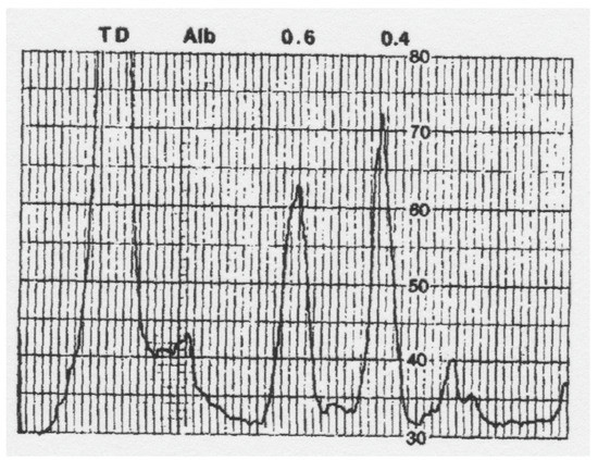 Native (non-denaturing) PAGE, in tube gels, of semi-purified rat ceruloplasmin, as detected by UV absorbance scanning of the gel at 280 nm. The top of the gel is at the right; the bottom, showing the tracking dye (TD), is on the left. Some albumin (Alb) was still present. Holo and apo ceruloplasmins migrated with Rfs of about 0.6 and 0.4, respectively. The resolving gel was 5% polyacrylamide, resolving buffer pH 8.8. Reprinted with permission from Middleton and Linder [28].