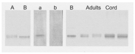 Subsequent analyses by Hirano et al. [29] of apo and holo forms of ceruloplasmin from subjects with Wilson disease and normal controls also used native PAGE. In Wilson disease, the transport protein in the transGolgi network that provides copper to ceruloplasmin (ATP7B) is dysfunctional to various degrees. Thus, much less or no copper is available for formation of the holo protein. Hirano et al. used a different form of native PAGE than in the Linder lab studies. The resolving gel was 8 vs. 5% acrylamide, and the pH for resolution was 7.4 vs. 8.8. This led to a much poorer separation (Figure 5). In addition, they detected the ceruloplasmin forms by immunoblotting. Although somewhat difficult to see, the results in Figure 5 show a single distinct protein band for apoceruloplasmin after treating the purified protein to remove copper (lanes B). This contrasts with the lanes for adult human plasma and cord blood, where two almost-overlapping bands are detected, presumably corresponding to the apo and holo forms. Densitometry applied to the immunoblots for nine Wilson disease patients and twelve control sera indicated that holoceruloplasmin was about half of the total (46%) in the controls (range 40–56%), while the percentages for Wilson disease patients varied from about 8% (considered negligeable) to about 40%, in five patients ages 4–12, and three patients, ages 12–18 years of age, respectively.