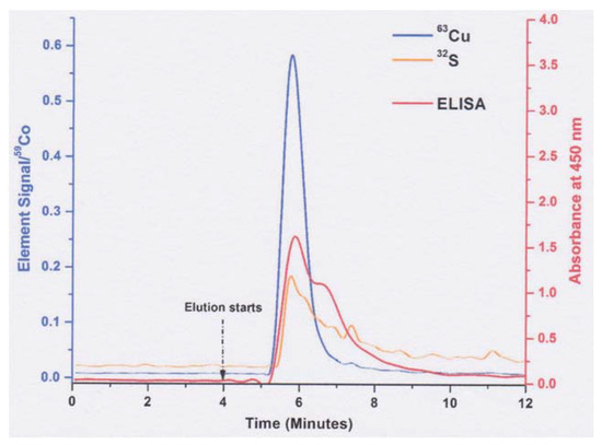 Immunoaffinity chromatography of human ceruloplasmin, coupled with ICP-MS to detect copper (blue line) and ELISA immunoassays to quantify ceruloplasmin protein (red line). Diluted blood serum was applied to the column to bind with the immobilized antibody against human ceruloplasmin, and proteins not binding to the antibody washing through. The graph shows what occurs when elution buffer is applied (glycine buffer, pH 2.2). The signal for 63Cu is given relative to the 59Co standard (left y-axis); ELISA absorbance values are on the right y-axis. The orange line is 32S, which reflects the elution of proteins in general. Reprinted without changes, from Bernevic et al. [32], via the Creative Commons license (http//creativecommons.org/publicdomain/zero/1.0/ (accessed on 30 December 2020)).