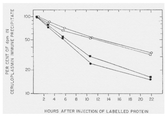 One conclusion related to the early rat studies of Holtzman and Gaumnitz on apoceruloplasmin (see earlier), was that the turnover of apoceruloplasmin (its removal from the circulation) was more rapid than that of the holo form [53]. In these studies, ceruloplasmin was separately isolated from the plasma of normal and copper-deficient rats (the latter with about 20% of normal ceruloplasmin enzyme activity). These rats had been preinjected with either 3H or 14C-labeled leucine to radiolabel the proteins. The resulting pure radiolabeled ceruloplasmins were given intravenously to two pairs of copper-deficient rats, and the loss of radioactivity in the immunoprecipitates of their plasma was followed over time (Figure 9). The data (from only four rats) show that the half-life of the infused ceruloplasmins was clearly different, being approximately 2.5-fold more rapid in the case of the ceruloplasmin that had a much lower proportion of the holo form. However, as they freely acknowledge, their data and calculations did not take into account the relative and unknown amounts of holoceruloplasmin in the ceruloplasmins from the normal and copper-deficient rats that had been infused, nor the inherent concentrations of apo and holo in the recipient rats, which are needed to accurately calculate rates of turnover. In addition, turnover was measured in copper-deficient rats, where turnover rates would be expected to differ from those of copper sufficient animals (therefore, these findings are preliminary at best). The half-lives of the infused “more apo” versus “more holo” ceruloplasmins were 6 and 12 h, respectively, and the 12 h value—for the “more holo” form agrees with data from a study by Marceau and Aspin [54], who calculated a half-life of 13 h after infusing normal rats with normal ceruloplasmin (which was probably half in the apo form). Later studies by our laboratory on the effects of estradiol on ceruloplasmin synthesis and turnover [28], indicated that turnover rates of the two forms were virtually identical. Using the double labeling approach of Arias et al. [55], rats were injected with 14C-leucine 17 h before the 3H-leucine and euthanized 3 h later. This allowed relative measurements of both rates of synthesis and degradation, higher ratios of 3H/14C reflecting higher rates of turnover, more 14C-protein having been degraded/removed during the time interval between the two injections. Radioactivity in apo and holoceruloplasmins was determined after their separation in tube gel electrophoresis (as in Figure 4) and were more or less identical (Figure 10). However, the double-labeling approach does not allow calculation of actual turnover rates, unless exactly the same doses of radioactive amino acid and the efficiencies of their counting are also known—which was not the case. Thus, in normal rats, removal of apo and holo ceruloplasmin from the circulation may be by the same mechanism, involving desialylation and uptake by the galactose receptor, but warrants further investigation.