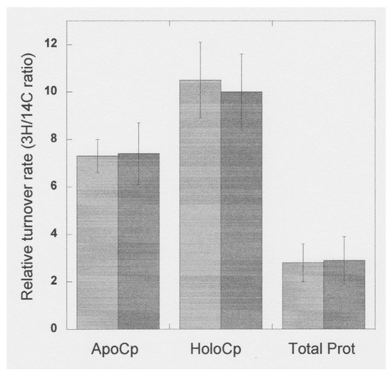 Relative rates of removal of apo and holo ceruloplasmin from the circulation, after synthesis in rats untreated and treated with estrogen, determined by double-labeling. Rats were injected with 14C-leucine, followed by 3H-leucine 17 h later, and euthanized 3 h later, following which their plasma ceruloplasmin was partially purified, separated in native PAGE tube gels (see Figure 4), and the radioactivity of both isotopes was determined in the apo and holo ceruloplasmin (Cp) gel bands, as well as in the total protein of blood plasma. Dark bars were for rats pretreated with 17β-estradiol for 14 days; light bars control rats only treated with vehicle. Data are means ± SD for groups of 5–10 animals. * p > 0.05 for the effect of estradiol. Data are from Middleton and Linder [28].