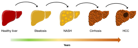 Non-alcoholic fatty liver disease (NAFLD) is defined as a continuum of abnormalities caused by lipid accumulation within the liver defined as hepatic steatosis. Fatty liver is considered as the liver manifestation of metabolic syndrome when is accompanied by simultaneously presence of three or more of the following features: high triglycerides, hypertension, visceral obesity, insulin resistance and high cholesterol, in the absence or reduced alcohol intake [1]. It ranges from non-alcoholic fatty liver (NAFL), characterized by > 5% of steatotic hepatocytes, to its more advanced and aggressive form known as non-alcoholic steatohepatitis (NASH). This latter form is characterized by extended liver inflammation and often accompanied by fibrosis which may progress to cirrhosis and hepatocellular carcinoma (HCC) (Figure 1). The strongest predictor of NAFLD/NASH is central or visceral obesity, rather than general obesity, while the presence of advanced fibrosis is the strongest predictor of mortality in those patients [2,3].