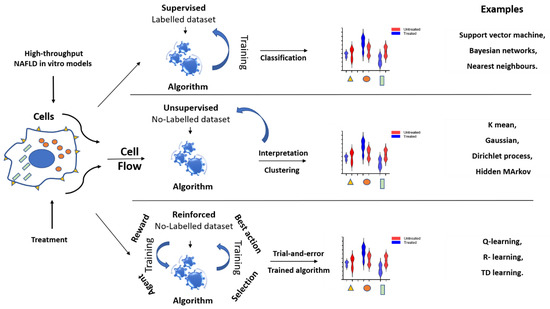 In another example, Mirsky et al. employed interferometric phase microscopy to develop a machine learning based classification method for sperm analyses and characterization [106]. The algorithm was able to extract 89 custom-designed features. This technology could be easily applicable to measure the degree of lysosomal permeabilization in hepatocytes upon treatment with saturated and unsaturated lipids [107]. This would give important insight about cell death. Ko et al. combines the nanofluidic technology with machine learning to discriminate between patients suffering of pancreatic cancer and healthy subject [108]. Although few human samples were analyzed, this study showed the potential of combining different technologies, in this case, nanofluidic, exosome screening and machine learning to better characterize patients in order to improve the success/failure ratio of clinical trial and/or treatment effectiveness.