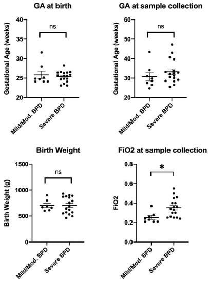 We obtained TAs from 25 mechanically ventilated preterm infants with mild/moderate BPD (n = 8) and severe BPD (n = 17). A summary of the patients’ clinical information is shown in Table 1, and individual data for main variables are visualized in Figure 1. As expected, FiO2 at the time of sample collection was significantly higher in the severe BPD group when compared to the mild/moderate BPD group (p < 0.05). No statistically significant differences were found for the rest of the measured variables, including GA at birth and at sample collection time, birth weight, day of life at sample collection time, male sex, and antenatal steroid exposure. Regarding the racial and ethnic composition of the patient cohort, there was a significant overrepresentation of Hispanic and mixed-race subjects in the severe BPD group when compared to the mild/moderate BPD group (p < 0.05).