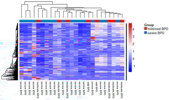 Heatmap of expression of 1048 miRNAs in tracheal aspirates from mild/moderate (n = 8) and severe (n = 17) BPD infants (normalized by global mean), obtained by PCR arrays. Heatmap generated in R using the NMF package as described in Section 2.