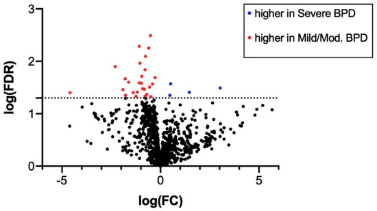 Volcano plot of miRNAs expressed in tracheal aspirates from mild/moderate (n = 8) and severe (n = 17) BPD infants. Red dots indicate miRNAs upregulated in mild/moderate BPD samples. Blue dots indicate miRNAs with higher expression in severe BPD samples. FC: fold change; FDR: false discovery rate. Dotted line indicates log(FDR) = 1.3, corresponding to FDR = 0.05. Volcano plot was generated in GraphPad Prism software as described in Section 2.