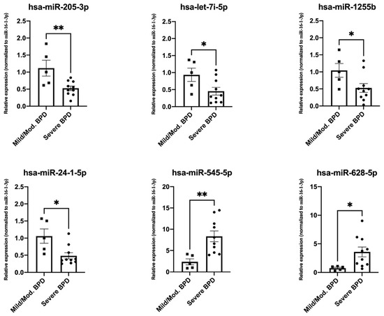 Validation experiments by real-time PCR and specific primers for hsa-miR-205-3p, hsa-let-7i-5p, hsa-miR-1255b, hsa-miR-24-1-5p, hsa-miR-545-5p, and hsa-miR-628-5p in a subset of mild/moderate (Mild/Mod.) BPD samples (n = 5) and severe BPD samples (n = 10). Y axes indicate relative expression values after normalization to hsa-miR-16-1-3p, and a mild/moderate calibration sample using the 2−ΔΔCT method [32,35]. Significant differences were determined by t-test using the GraphPad software (* p < 0.05, ** p < 0.01).