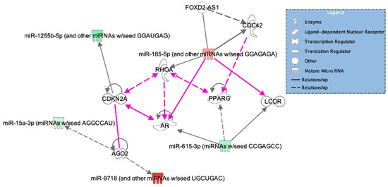 The Ingenuity Pathway Analysis (IPA) software (QIAGEN Inc., Germantown, MD, USA) was used to identify miRNA interaction networks, predicted target genes, and molecular functions based on prediction scores [34]. The IPA core analysis functionality was performed for both direct and indirect relationships using the Ingenuity Knowledge Base. The miRNAs of interest were analyzed using the microRNA target filter feature. Only experimentally observed or predicted with high confidence targets in humans were considered.