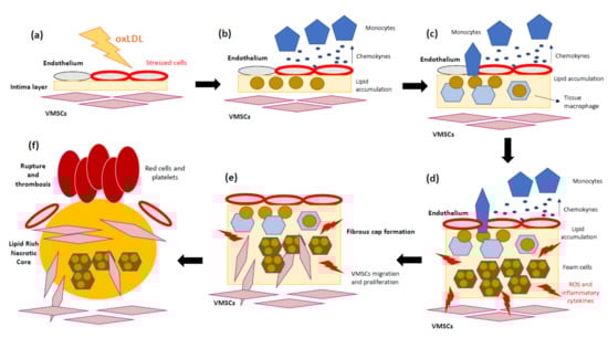 Schematic overview of atherosclerosis progression. (a) Oxidized low-density lipoprotein (oxLDL) contributes to the initial lesion in the arterial wall. (b) Endothelium cells produce pro-inflammatory cytokines, and circulating monocytes are recruited. (c) Monocytes migrate into the intima and differentiate into tissue macrophages. (d) Once in the artery wall, macrophages engulf the excessive lipids and become lipid-laden foam cells, which can accumulate and form a fatty streak. During the complex lesion progression, foam cell lysis by apoptosis and necrosis leads to the formation of a necrotic core and, together with defective efferocytosis, leads to the amplification of the inflammatory response. (e) Vascular smooth muscle cells (VSMCs) migrate from the media to the intima, where they differentiate into proliferative synthetic cells that generate extracellular matrix to form the fibrous cap and hence stabilize plaques. (f) During later stages, the plaque can become unstable due to the inhibition of extracellular matrix (ECM) formation, particularly collagen production by VSMCs. In addition, ECM is degraded by proteases released by macrophages, resulting in an unstable lesion that can rupture and lead to thrombosis.