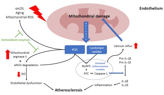 Relationship between mitochondria and atherosclerosis in the endothelium. Mitochondria play a key role in endothelium function, participating in several processes, such as nitric acid production, intracellular signaling, and cell death. Excessive reactive oxygen species (ROS) production leads to endothelium senescence, apoptosis, and atherosclerosis progression. Mitochondria can be damaged by oxLDL, ROS (mostly from mitochondrial origin), and the aging process. Damaged mitochondria release several mitochondrial components such as mtROS, cardiolipin and mtDNA which induce nod like receptor family pyrin domain containing 3 (NLRP3) inflammasome activation, leading to inflammation by increasing interleukin 1β and 18 maturation. Chronic NLRP3 activation will eventually lead to more mitochondrial damage by promoting mitochondrial calcium influx. Also, higher ROS levels disrupt the NO balance by boosting mitochondrial arginase II activity and causing eNOS degradation. In endothelium, the reduction of NO levels may also promote endothelial dysfunction and atherosclerosis. Most of these ROS-derived alterations are prevented by antioxidants enzymes (green block arrows).