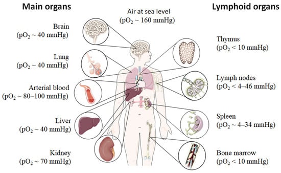 Oxygen partial pressure (pO2) varies throughout the human body from main organs to lymphoid tissues. Figure was modified from Servier Medical Art, licensed under a Creative Common Attribution 3.0 Generic License [16].