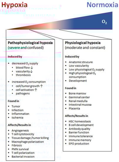 Immune cells and proper immune response require focal sites of immune cell development, maturation, activation, tolerance, and longevity also defined as immunological niches bearing a certain microenvironment to maintain immune homeostasis [1]. These organs and tissues include the bone marrow, placenta, intestinal mucosa, renal medulla, secondary lymphoid organs, and the thymus [2,3]. In tissue pathology, sites of high immunological activity lead to inflammation and as a result tissue dysfunction bearing certain pathological microenvironment features. These pathological sites include infected, inflamed, and ischemic tissues and tumors [4,5,6,7]. Of note, sites of immune activity with distinct microenvironmental entities can broadly range between a state of immune homeostasis and a state of immune pathology. Under certain conditions of severe and disorganized immune activity, inflammation can perpetuate as a result of immune dysfunction leading to autoimmunity or culminates into inflammation-driven tumor development [8]. Microenvironmental conditions at sites of physiological and pathological immune activity play a key role in the development of effective immune response and pathological immune dysfunction by modulation of immune cell function. Understanding the impact of the microenvironment in sites of immune activity and adaptation mechanisms in immune cell reprogramming may yield into new therapeutic treatment strategies against a dysfunctional immune response as found in autoimmunity and cancer. At sites of immune activity under physiological and pathophysiological circumstances, immune cells become highly metabolically active and activate bystander cells and surrounding tissue. As a result, microenvironmental features rapidly change by increasing the amount and number of humoral factors, metabolites and a decrease in oxygen leading to a state of hypoxia—a condition where cellular oxygen demand exceeds the oxygen supply [9,10]. Constant supply of oxygen is a prerequisite for the energy homeostasis of respiring cells. Oxygen plays a vital role in all eukaryotes, being the terminal electron acceptor of the mitochondrial electron transport chain, which finally feeds the proton gradient for the generation of ATP via oxidative phosphorylation. If the constant supply with oxygen does not anymore meet the requirements of cells, hypoxic conditions will be established and, if sustained, these conditions will ultimately result in cell death. Hypoxia arises in a variety of immunological situations under physiological and pathophysiological immune activity [10,11].