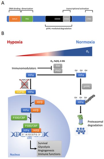 The HIFs are mainly composed of two basic helix-loop-helix (bHLH) proteins which dimerize via a PAS (Per, AHR/ARNT, Sim) domain, as defined by sequence homology to the Drosophila Per and Sim proteins and the mammalian aryl hydrocarbon receptor (AHR) and aryl hydrocarbon receptor nuclear translocator (ARNT) proteins [66,67] to form the transcription factor HIF (Figure 3A). The heterodimeric HIF consists of an oxygen-dependent alpha-subunit (stabilized under hypoxia) and a constitutively expressed beta-subunit (HIF-1β or ARNT). Three α subunits have been described so far: HIF-1α, HIF-2α, and HIF-3α. While HIF-1α and HIF-2α are well characterized, relatively little is known about HIF-3α [68,69,70,71,72]. HIF-1α regulation itself ranges from transcriptional to translational and posttranslational level [73].