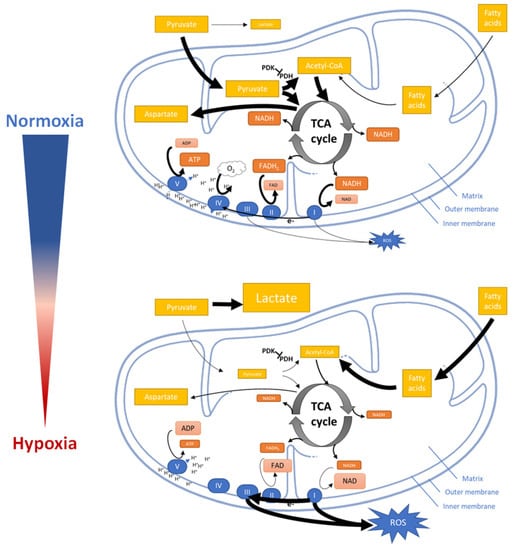 Impact of hypoxia on mitochondrial functions. Under normoxia, pyruvate is shifted into the mitochondria and catalyzed to Acetyl coenzyme A (Acetyl-CoA) as a substrate for the TCA cycle (tricarboxylic acid cycle) to synthesize energy-rich reductants (NADH and FADH2) which drive the electron flux through the ETC and provide Aspartate. Under hypoxia, pyruvate is catalyzed to lactate while only few amounts of Acetyl-CoA are provided by fatty acid oxidation to the TCA. Only low amounts of energy-rich reductants and ATP are produced. The lack of the final electron acceptor (oxygen) leads to ROS generation during electron flux through the ETC. (Large arrows indicate higher flux; smaller arrows indicate lower flux; larger icons indicate higher amounts of intermediates; smaller icons indicate lower amounts of intermediates). Figure was modified from Servier Medical Art, licensed under a Creative Common Attribution 3.0 Generic License [16].