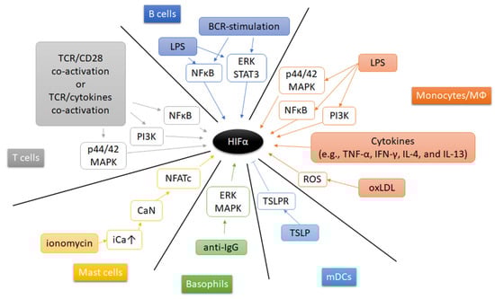 Beside hypoxia, other extracellular microenvironmental factors (such as pathogens, cytokines, metabolic enzymes and metabolites) contribute to the induction and stabilization of HIF’s in immune cells (Figure 5). Under normoxia, Gram-positive and Gram-negative bacterial components induce HIF-1α expression and stabilization in mouse bone marrow-derived macrophages [163]. Treatment of macrophages with lipopolysaccharide (LPS), a major component of the outer membrane of Gram-negative bacteria, and associated activation of Toll-like receptors (TLRs) in macrophages, increases HIF-1α expression and leads to its stabilization by multiple pathways, such as PI3K pathway [256], p44/42 MAPK and NFκB pathway, but also by activation of pyruvate kinase M2 (PKM2) [257], and by accumulation of succinate after glutaminolysis [187,258]. Interestingly, the glycolytic enzyme pyruvate kinase M2 (PKM2) has been demonstrated to shape the cellular response to hypoxia thereby affecting the immune response. PKM2 controls the rate-limiting step of glycolysis and supports glycolysis and the biosynthetic processes [257,259,260]. Furthermore, in LPS-stimulated monocytes PKM2 has been demonstrated to translocate to the nucleus and to interact with HIF-1α thereby inducing the expression of inflammatory genes such as the expression of IL1B, STAT3, HMGB1 (encoding IL-1β, signal transducer and activator of transcription, and high mobility group box 1) [257,259,260,261,262,263]. Furthermore, tumor necrosis factor-α (TNF-α) and interferon-γ (IFN-γ) are capable to increase HIF-1α mRNA expression in macrophages [264], while IL-4 and IL-13 increase HIF-2α mRNA abundance [171]. Moreover, oxidized low-density lipoprotein (oxLDL) induces HIF-1α accumulation by a ROS-dependent pathway in human macrophages [265]. Recent findings revealed that atheroma plaque homogenates increased human macrophages’ HIF-1α by forming liver-X-receptor (LXR)-HIF-1α-complexes on HIF-1α- and IL-1β-promoter-regions promoting inflammation in atherosclerosis [266]. Activation of mast cells with the calcium ionophore ionomycin enhanced HIF-1α gene and protein expression by activating calcineurin-dependent dephosphorylation of nuclear factor of activated T-cells (NFAT) thereby unleashing NFAT-dependent transcription [267]. Additionally, anti-IgE induces accumulation of HIF-1α protein in human basophils by activating extracellular regulated kinase (ERK) and p38 MAPK [169]. In mDC, neutralization of thymic stromal lymphopoietin (TSLP) and its receptor (TSLPR) during stimulation augments HIF-1α leading to an increased IL-1β expression [268].