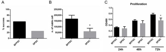 The growth of BFPSCs and DPSCs was assessed at the first passage, showing a significantly reduced number of viable cells in cultures of DP compared to BFP, as shown in Figure 1B. The proliferation of BFPSCs and DPSCs was comparable in the first 48 h of culture, whereas the results were significantly lower for DPSCs than for BFPSCs after 72 h of culture (Figure 1C). These data suggest that BFP is a valuable source from which to derive MSCs.