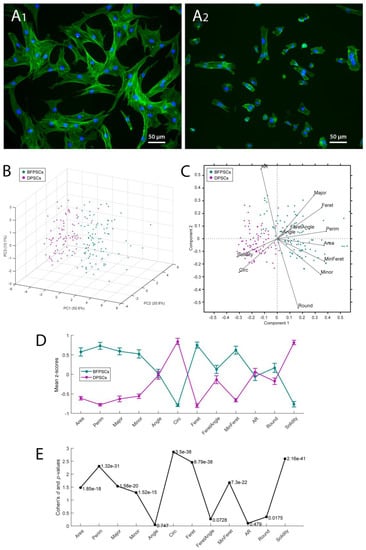 Morphological characterization of BFPSCs (A1) and DPSCs (A2). Staining with Alexa488-Phalloidin and DAPI showing the actin network and nuclei, respectively, of BFPSCs and DPSCs. Magnification 200×. (B) Two sets of cells consisting of n = 96 BFPSCs (from 24 independent pictures) and n = 90 DPSCs (from 15 independent pictures) were used for quantitative morphometry assessment. Twelve shape descriptors were computed for each cell and principal component (PC) analysis allowed representing the two experimental groups in the reduced space of the first three PCs (together accounting for more than 86% of the total dataset variability). (C) Biplot representing the two groups of cells in the space of the first two PCs together with the projections of the 12 original axes (one for each shape descriptor considered). (D) For a comparative evaluation of the most influential features, mean ± standard error of measurement (SEm) was evaluated for the two groups separately, starting with the z-scores of each descriptor (i.e., after distribution standardization). (E) For each single shape descriptor, the related effect size (Cohen’s d) and the p-value resulting from the marginal univariate t-test are reported.