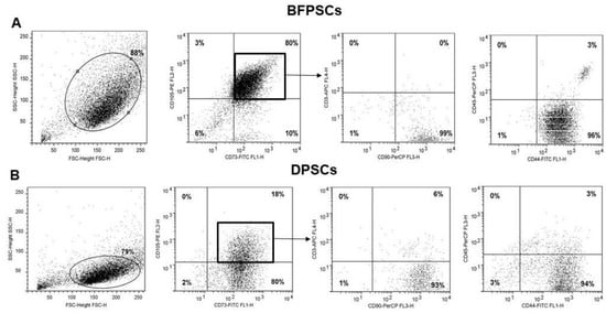 A flow cytometry analysis confirmed the different morphology of BFPSCs and DPSCs by examination of their physical parameters (forward- and side-scatter) (Figure 3). Both BFPSCs and DPSCs expressed markers of MSC phenotypes, such as CD105, CD44, CD73, and CD90, while lacking expression of CD45 (a marker of hematopoietic cells) according to the requirements proposed by the International Society for Cellular Therapy (ISCT) for defining MSCs [26]. The percentages of expression of these markers were not different between BFPSCs and DPSCs and are reported in Table 2.