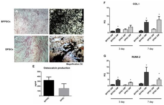 We investigated the osteogenic differentiation potential of the isolated BFPSCs and DPSCs. After 14 days of culture in the osteogenic medium, both the BFPSCs and the DPSCs were able to differentiate into osteoblast-like cells, as shown by the expression of ALP (Figure 4A,C) and by the mineralization granules released in the culture (Figure 4B,D). We also dosed the release of osteocalcin in the cell culture media without significant differences showing between the BFPSCs and the DPSCs, even though the level of osteocalcin was higher in the BFPSCs than in the DPSCs (Figure 4E). To assess the early osteogenic differentiation of BFPSCs and DPSCs, the transcript levels of the collagen type I (Figure 4F) and RUNX-2 (Figure 4G) genes were evaluated through quantitative RT-PCR at 3 and 7 days. As it is possible to appreciate from Figure 4, the BFPSCs and DPSCs were properly induced toward the osteogenic commitment, and the bone markers were constantly higher in the osteodifferentiated cells than in the control.